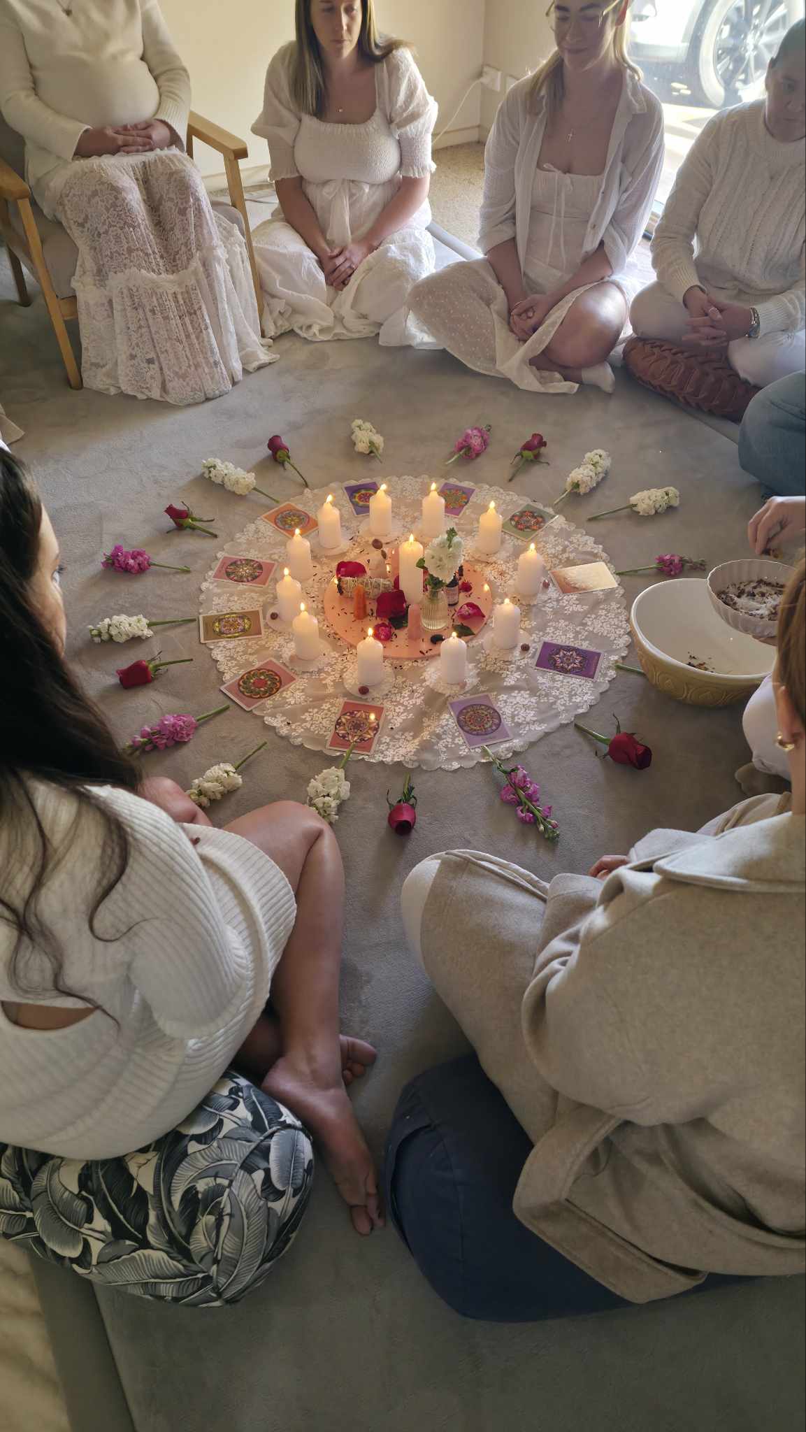 You organise the location, whether your home or venue, ensuring there is a cushion or seat for everyone, invite your inner circle, and I will bring all the ceremonial items.